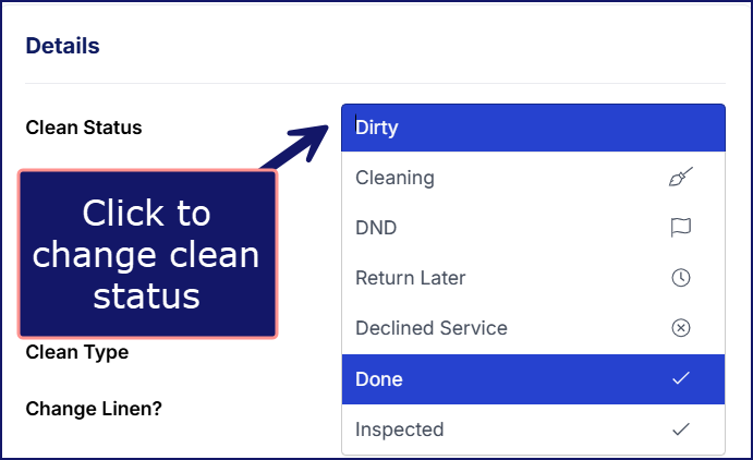 2. Change the Clean Status (e.g., from "Dirty" to "Cleaning" or "Done").