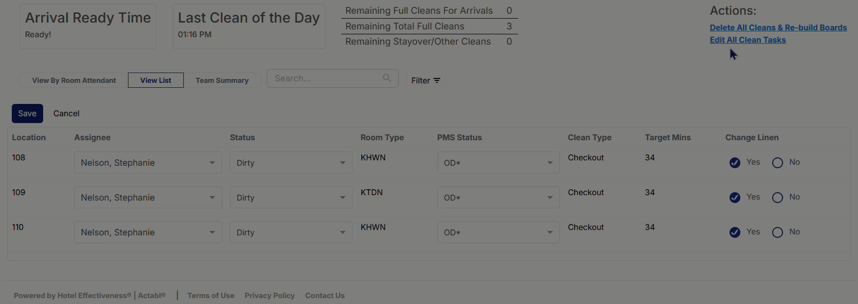 1. If a room needs to be moved, click Edit All Clean Tasks to reassign the room to a different attendant's board.