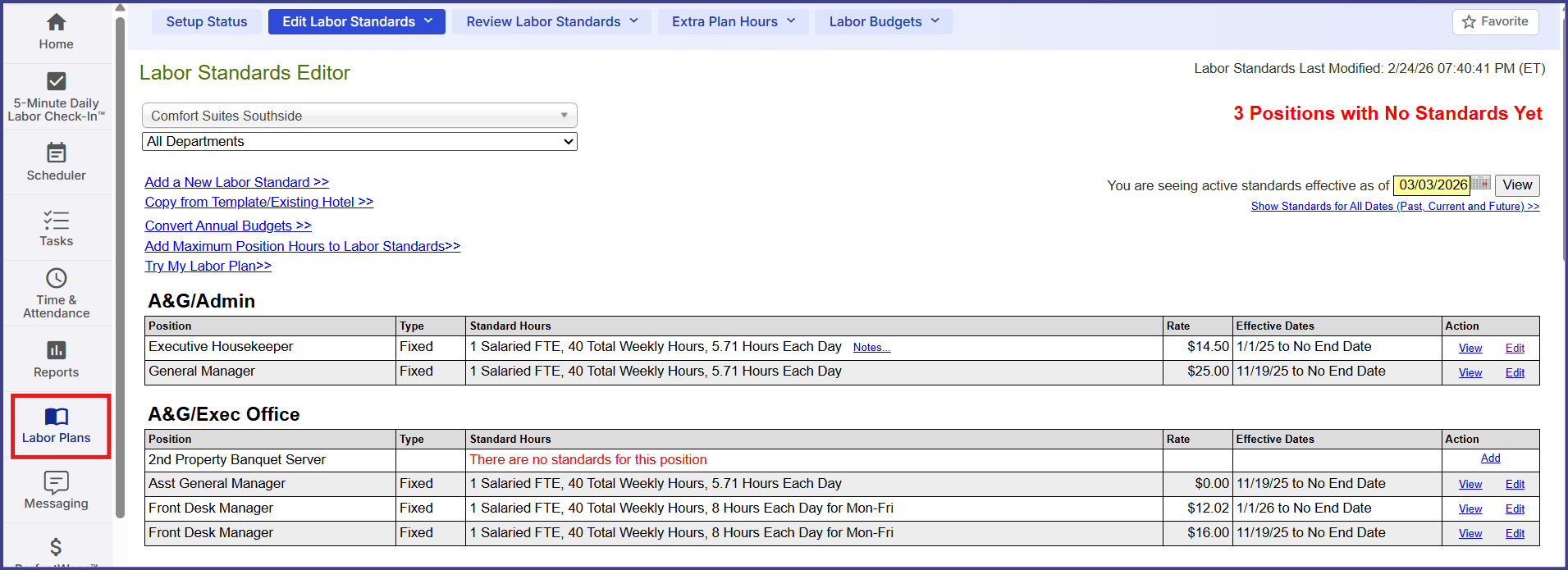 - Click 'View/Edit' next to the desired hotel. This will take you to the Labor Standards Editor Page.