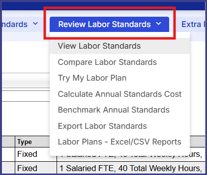 The Labor Plans tool provides access to create and edit Labor Standards, compare Labor Standards, calculate Annual Standards Cost, manage Extra Plan Hours, and access the Budgeter tool through four sub-navigational menus. Please note, some access to these pages may be limited due to user permissions.