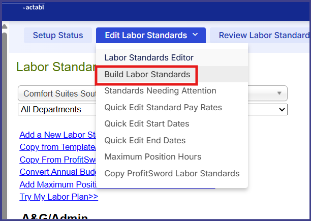After accessing the "Labor Plan" tab, hover over 'Edit Labor Standards' in the blue menu and select "Build Labor Standards".