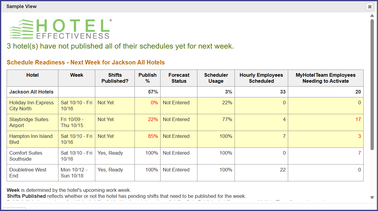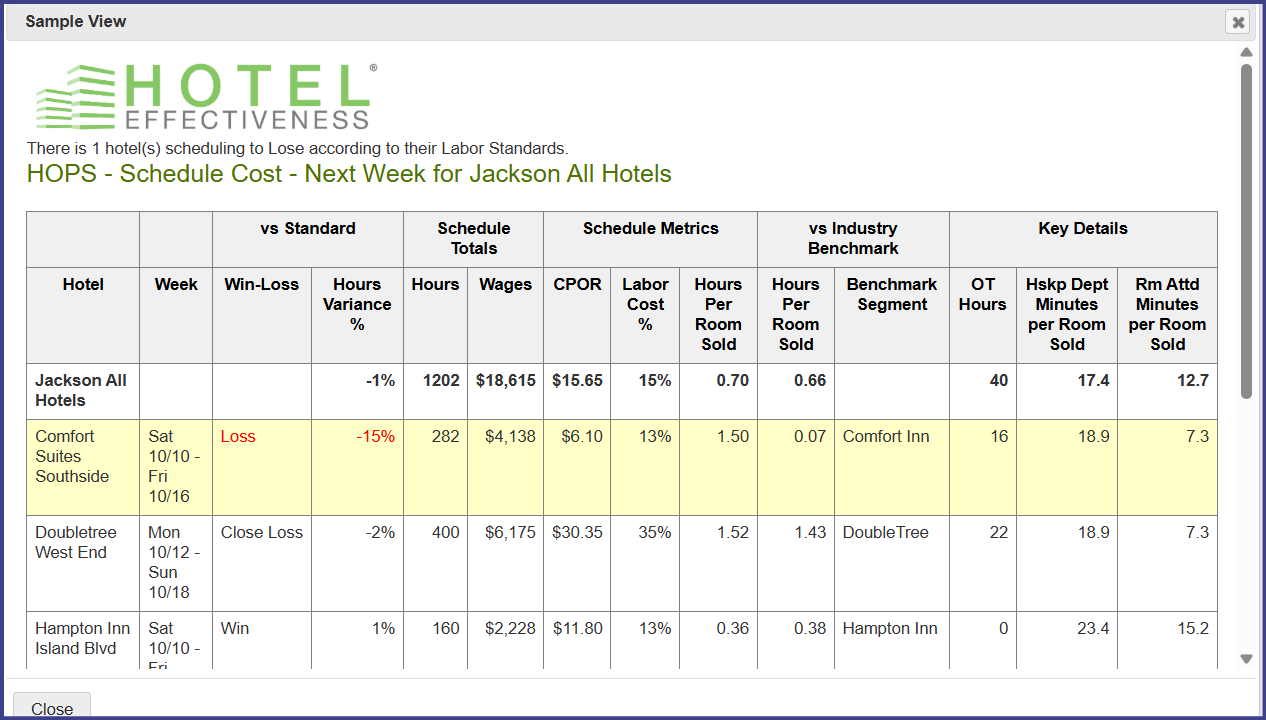 In order for the HOPS alerts and reports to show meaningful data, your hotels must enter and publish schedules in Hotel Labor Scheduler. They also need to enter the number of rooms cleaned by room attendant through Night Audit Entry or Housekeeping Gameday in Hotel Effectiveness.