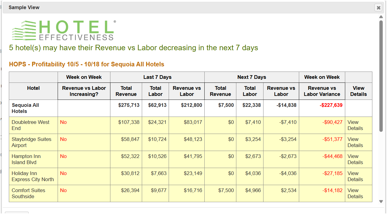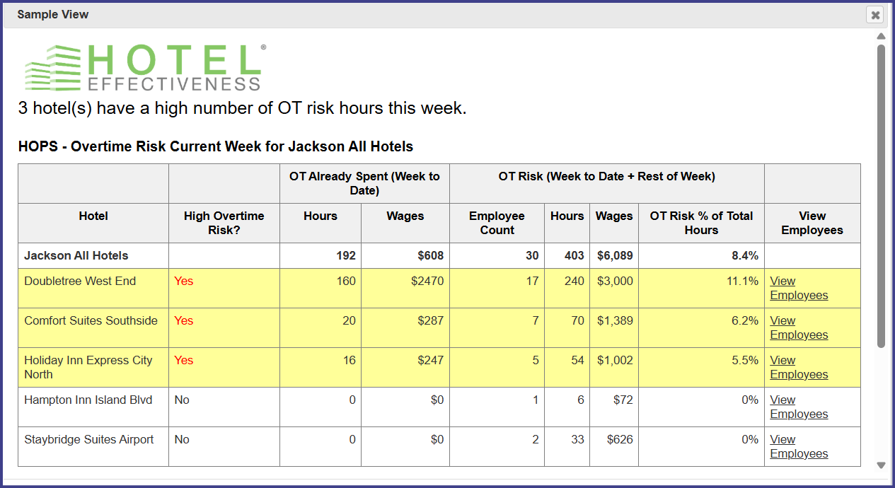 You can view the HOPS reports directly in Hotel Effectiveness. Not only can you select a specific hotel group (set up by you for your own use) or a hotel portfolio (defined by your corporate office for all users within your organization), but you can also modify reporting timeframe in these reports with the exception of the Overtime Risk (Portfolio) Report which looks at the data of the current work week.