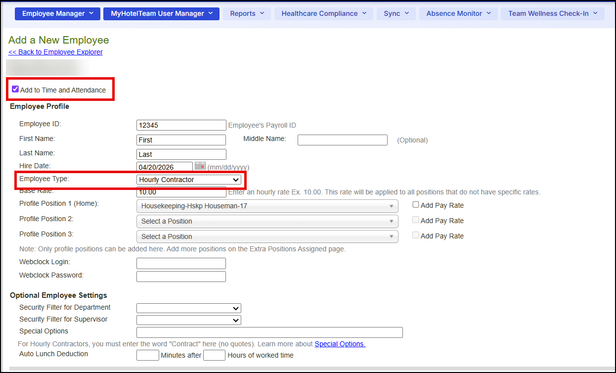 - Important: If you are a Hotel Effectiveness Time & Attendance customer and this employee should have a time card, leave the 'Add to Time & Attendance' checkbox checked at the top of the employee profile.
