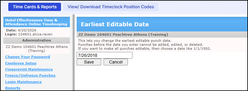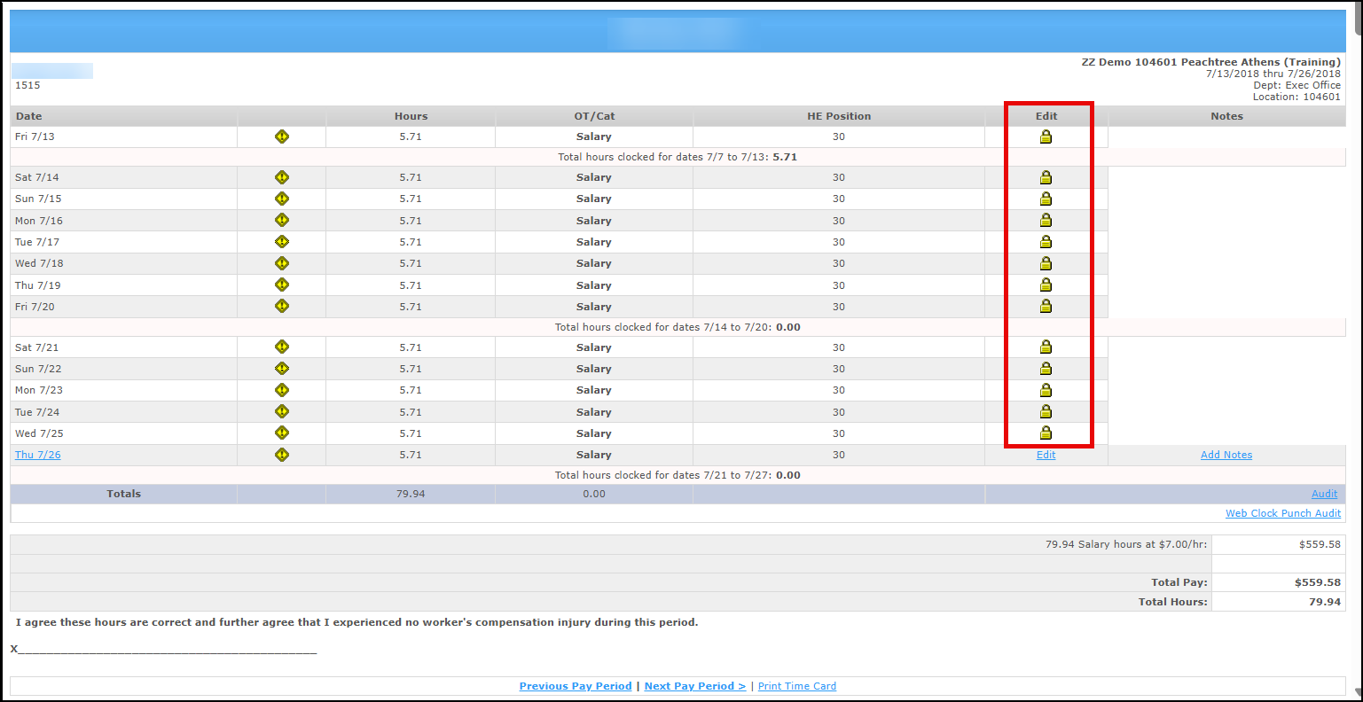 For example, if you want to lock the pay period from Friday 7/13/18 to Thursday 7/26/18, you would simply enter 7/26/18. All periods in the past including this one would be locked. Once you click Save, all punches up to and including that date will not be available for any changes (add, edit, delete punches). - You can verify this is activated by going to the time cards for the previous period. Instead of Edit link next to each punch, you will only see a "lock" icon indicating no changes are allowed.