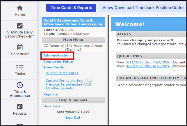 -Select hotel if you have access to multiple - Click the Administration link in the left main menu