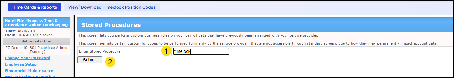 - In the text box labeled "Enter Stored Procedure," type in the word: timelock (all one word, lowercase), Click the Submit Button.