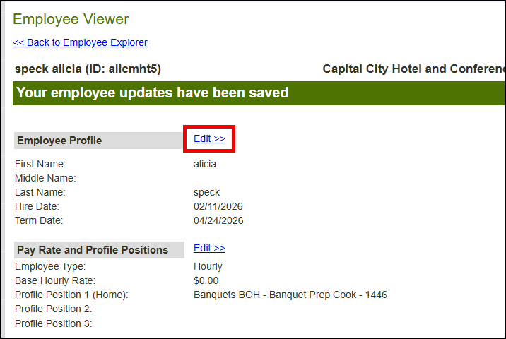- In Employees (left navigation menu), select the desired hotel from the hotel dropdown list, click 'View/Edit' next to the appropriate employee's name, select "Extra Positions Assigned" and then with the appropriate access, you should have an 'Edit' button next to the position. You can then assign any additional positions to the employee.