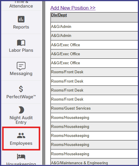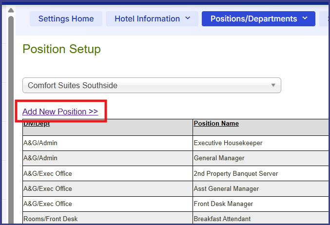 - Choose Position Setup under Positions/Departments. If you have multiple hotels, you'll need to choose the correct hotel from the drop down