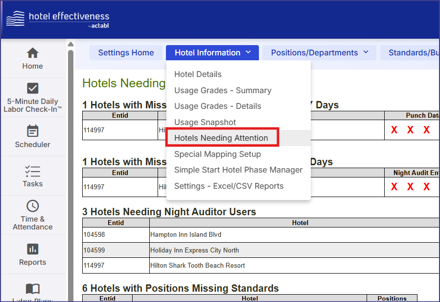 - Hotels with Missing Actual Punch Data in the Last 7 Days