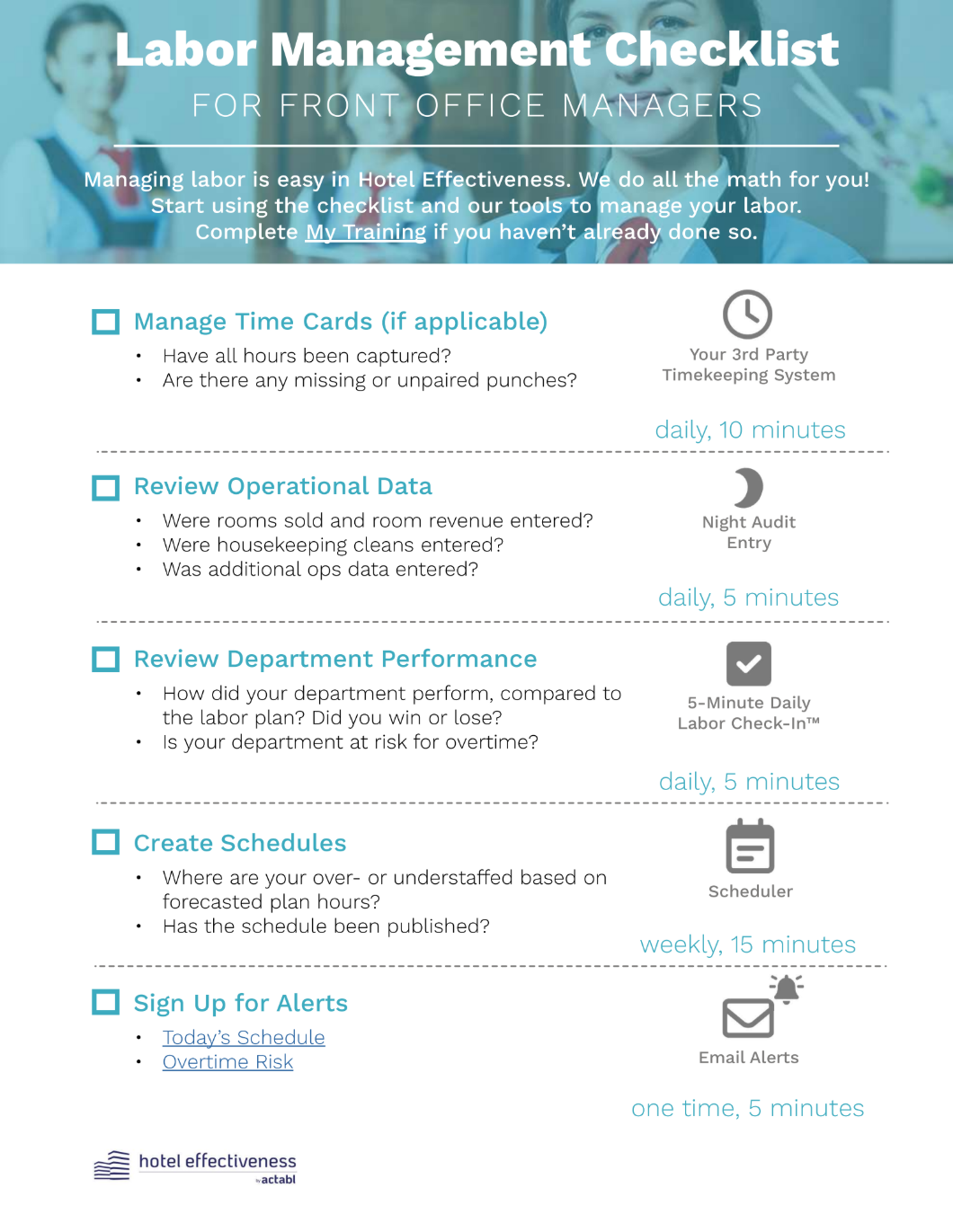 Front Office Manager Labor Management Checklist Alicia Raven March 20, 2026 15:38 Updated Labor Mgmt Front Office Managers.pdf 300 KB Download Related articles Housekeeping Manager Labor Management Checklist Retaining Time & Attendance Records F&B Manager Labor Management Checklist General Manager Labor Management Checklist HOPS Email Alerts & Reports for Corporate Managers Comments 0 comments Article is closed for comments.