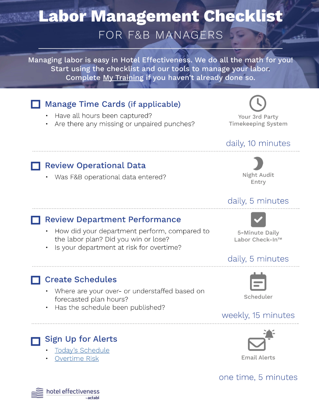F&B Manager Labor Management Checklist Alicia Raven March 20, 2026 15:38 Updated Labor Mgmt F&B Manager.pdf 400 KB Download Related articles Department Managers Labor Management Checklist Housekeeping Manager Labor Management Checklist How to Setup Custom Employee Reorder in Scheduler Labor Planning and Budgeting Guide Hotel Effectiveness FAQ: Troubleshooting & Common Questions Comments 0 comments Article is closed for comments.
